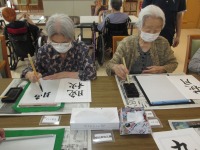 こんにちは、デイサービスです。今日の書道教室は「9月」「晩秋」「中秋の名月」「萩月」などのお手本を用意して取り組んでいただきました。敷島デイサービスのご利用者様は書道経験者の方も多く、今回もご自分の筆を持参してくださる方もいらっしゃいました。皆さんご自分が納得できる作品になるまで何枚も集中してくださっていました(@_@)自信作品を選んでもらって、ホワイトボードに貼って鑑賞会をしました。お互いの作品をほめ合っていい気分になるところまでが書道レクの流れになっています(笑)