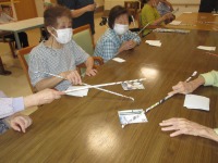 こんにちはデイサービスです。今日のレクはカードゲームということで、おなじみ「上毛カルタ」とトランプゲームをしました。上毛カルタはみなさまお得意のようで読み札を詠むと「はい!あったよー」とすぐに見つけておりましたが、トランプゲームではいつもの「ババ抜き」ではなく、「豚のしっぽ」と言う新たなゲームにチャレンジしました。トランプを裏に向けてリング状に並べ一枚ずつカードを引き、真ん中に出します。次の方がまた一枚引いて真ん中に出したカードの数字とマークと違えばクリア、どちらか一つ同じだと真ん中に出したカードをすべて没収しなければないというルールです。みなさま初めてチャレンジしたので戸惑う様子もありましたが、だんだんと楽しそうな表情に変わりとても大盛り上がりでした♪ にぎやかな声がデイルームに響きわたっていました(^^♪