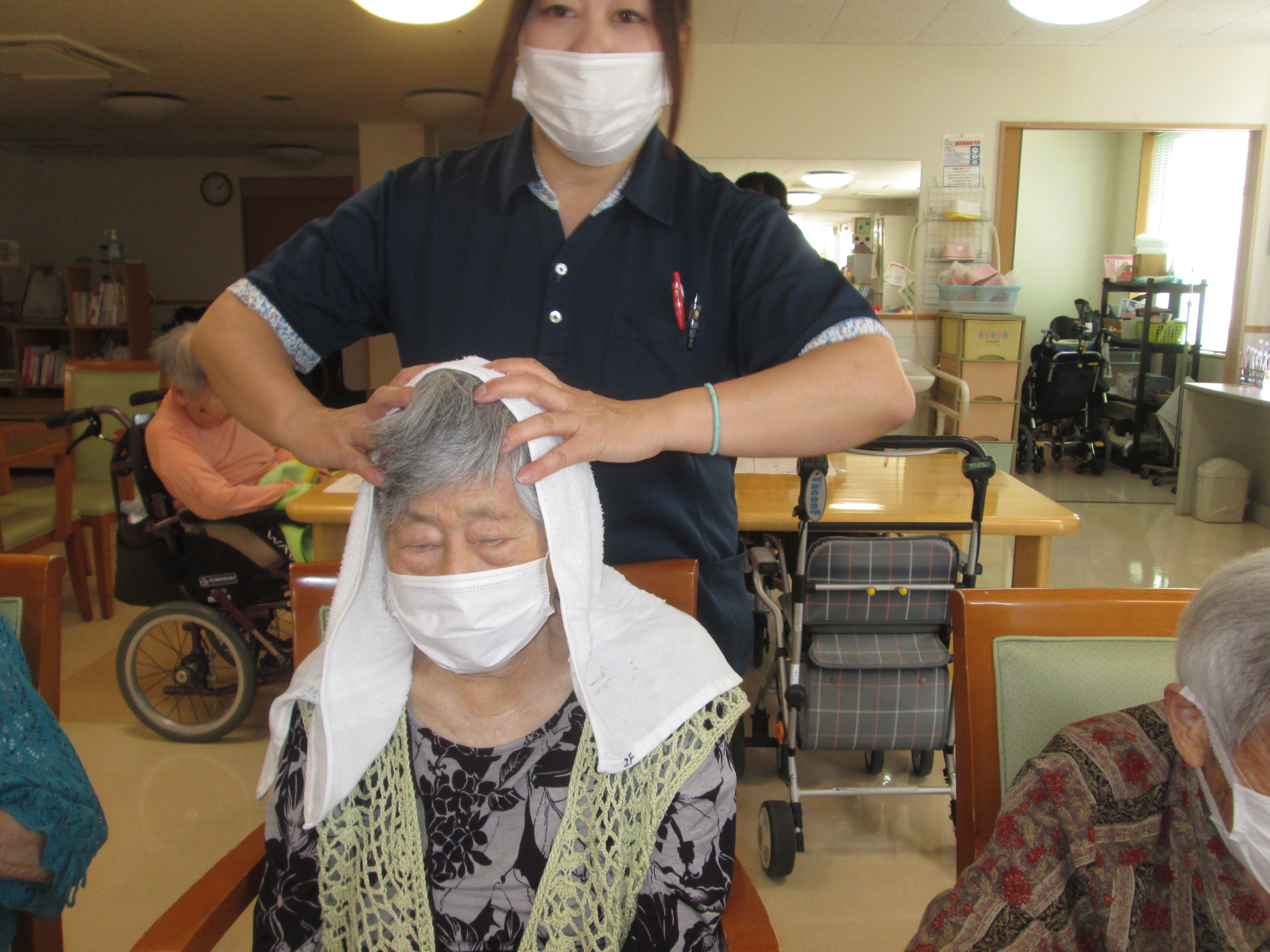 こんにちは、デイサービスです。今日のリラクゼーションレクは頭~肩にかけて職員がマッサージを行いました(^^♪ 見よう見まねのマッサージですが「こんなに気持ちいいマッサージ初めて」「肩がほぐれてよかった」と皆さんとても喜んでくださっていました。あいまに脳トレプリントに取り組んでもらったのですが、マッサージ後は頭がスッキリしたから問題がスラスラ解けちゃうとプリント問題もはかどっていらっしゃいました(@_@)