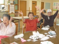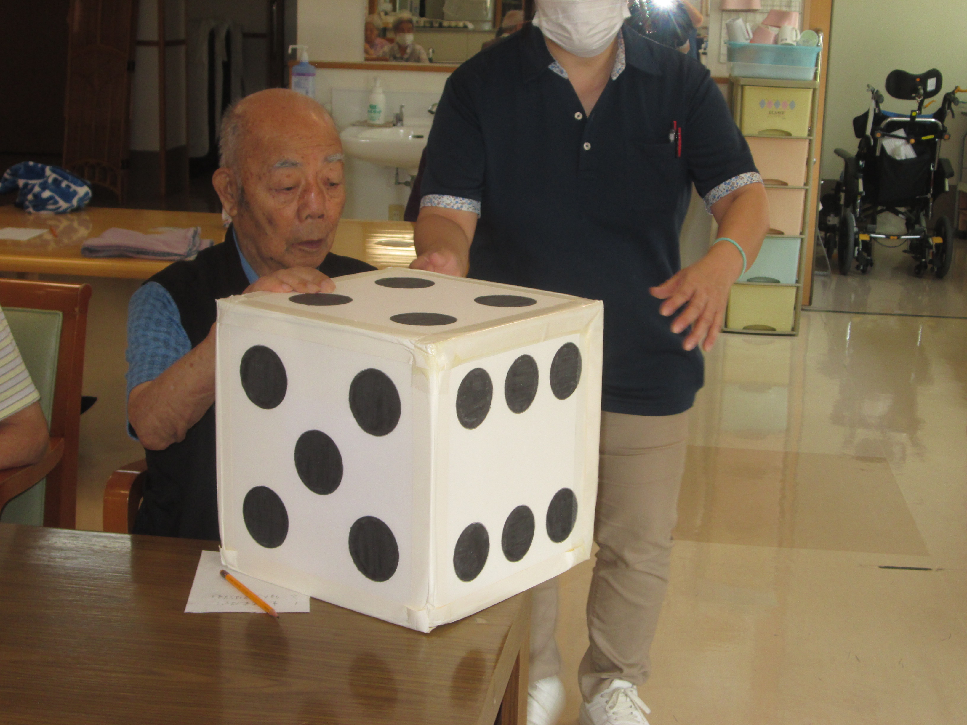 こんにちは、デイサービスです。今日はゲームレク(サイコロゲーム)です。みなさまにサイコロを投げてもらいサイコロの出た数の質問に答えるゲームです。自分の長所短所は? 生まれ変わったら誰になりたい? 子供の頃のあだ名は何?など みなさま、自分はサイコロの目が何が出るのか、ワクワク(^^)ソワソワ(*_*)でした。その他に懐かしの黒ひげ危機一髪Σ(゚Д゚)も楽しんでいただきました。今日もみなさまの笑い声がたくさんのレクリエーションでした。(*^^)v