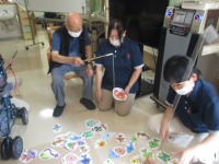 こんにちは、デイサービスです。今日は魚釣りゲームレクでした。イカ、タコ、鯛、ふぐ、ウニなどの魚介類のイラストを釣り竿で釣ってもらいます。どちらにも磁石がついている仕組みで、魚介類のイラストの裏には5~100点の点数が記載されているので最後に合計点数を競ってもらいました。高級魚が点数が高いとは限らず、釣ってみるまでわかりません(@_@)釣り経験があるからといってこのゲームが上手にできるというわけではないところもこのゲームのポイントです。「ヒトデを釣っちゃったよー」「ウニなのに点数が5点だよ」など楽しそうな会話で盛り上がっていました♪