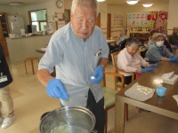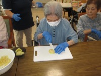 こんにちは、デイサービスです。今日の料理教室レクはフルーツポンチを作りました。はじめに桃、パイナップル、キウイなどのフルーツを切ります。豆腐と白玉粉を混ぜて白玉団子をいつもより小さめの大きさで作って茹でました。職員が事前に作ったときに白玉団子を小さくした方が美味しいと発見したとのことで小さめの白玉団子になりました(笑)器に盛りつけて最後に三ツ矢サイダーを注いで完成です(*^-^*)冷たくて、さっぱりしているけど甘くて美味しいと大好評でした♪