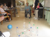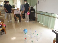 こんにちはデイサービスです。本日のレクは毎月恒例のボウリングを行いました。利用者様にも大人気の運動レクです(^^♪ ここでは空のペットボトルに重しとなるビー玉を入れてボウリングのピンに見立てて行います。本日の利用者様はボウリング経験者の方が多く、「よーし! 昔を思い出して投げてみるか」「懐かしいな~、良くボウリング場に通ったんだよ(^^♪」と口々に仰り、みなさま楽しそうに投げていました。コントロールもよくしっかりとピンに当ててる方がほとんどでした! 投げ終わると「もう一回リベンジしたい!」と再挑戦される方もおりました。デイルーム内はとても活気に満ちあふれ、大にぎわいの一時間となりました♪