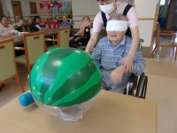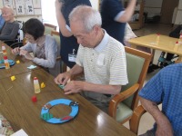 こんにちは、デイサービスです。昨日に引き続き今日も夏のリース作りを行いました(*^-^*)真ん中をくり抜いた紙皿におはながみを巻き付けて土台のリースとなっています。折り紙で丸ごとスイカとカットしたスイカを作ってもらいました。クワガタは職員が事前に準備したものを使用しました。「夏らしい飾りができたね。」「こんなにかわいいのができて嬉しい。」と皆さんから嬉しい感想を聞かせてもらえました。リースは8月初め頃までお借りしてデイルームの壁面に飾らせてもらうことになりました(^^♪