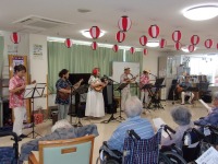 また、13時30分からは「おたまじゃくしの会」の皆様にお越しいただき、ウクレレの演奏やフラダンスで夏らしさを更に演出していただき、一緒に歌って踊って楽しい時間を過ごすことができました。懐かしい歌謡曲は入居者様に大好評でした!