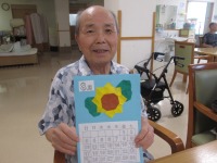 こんにちはデイサービスです。本日は8月のカレンダー制作ということで「ひまわり」をモチーフにした夏らしいカレンダーを作りました。みなさまには折り紙で大きな一輪のひまわりを折っていただきました。職員が折り方の説明をすると「わー! 難しくてできないよー」と仰る方もいましたが、お隣さんや職員と一緒に取り組みながら楽しそうに可愛らしいひまわりを完成させていらっしゃいました(^^♪ 台紙の空色が黄色いひまわりとマッチしていて夏らしい作品になりました。「可愛く出来たから早く部屋に飾りたいな♪」「持って帰ってひ孫に見せよう♪」とみなさま笑顔で話されてました。今回のカレンダー制作も皆様に喜んでいただけました\(^_^)/