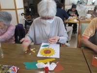 こんにちはデイサービスです。本日はこの時期にぴったりの向日葵のちぎり絵を行いました。みなさまに下絵と折り紙をお渡しすると早速ちぎり始め真剣な表情で取り組まれてました。向日葵の花びらはとても細かいので苦戦される方もいらっしゃいましたが、職員と一緒に冗談を言いながら楽しそうに取り組まれました(^^♪ 本日の利用者様は手先が器用な方が多く見事な作品が仕上がりました。 手先を使う作業なので脳の活性化にもつながり座ったまま出来るレクなので利用者様にも大人気です。「可愛く出来たから早く孫に見せたいな」「早速もって帰って部屋に飾るよ」と皆様笑顔で仰っていました(^^♪