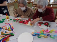 こんにちは、デイサービスです。今日はクリスマスリース作りを行いました。真ん中をくり抜いた紙皿におはながみを巻きつけたものがリースになっています。ご利用者様には折り紙でサンタクロースとトナカイを折ってもらい、シールやリボンでお好きにデコレーションをして完成です。素敵なリースができたと大好評でした。リースはデイルームに飾らせてもらい、来月中旬にはご利用者様にお渡しする予定です(*^-^*)