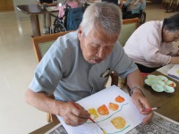 こんにちは、デイサービスです。今日はホオズキの下絵を使って水彩画に取り組んでいただきました。色付けしながらも会話が弾みます。「子どもの頃、実を指でもんで、なかの果肉を取り除くのが難しくてうまく出てこずに果皮が破れちゃうんだよね。破れると音は鳴らないんだよ。」「ぎゅっぎゅっとカエルの鳴き声のような音が鳴るんだよね。」と楽しそうな話で盛り上がっていました(*^-^*)同じ下絵を使っていても完成作品の雰囲気が全く違うので不思議です。デイルームの水彩画コーナーが一段と華やかになりました♪
