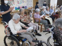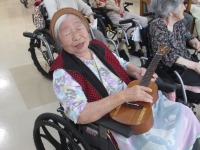 こんにちはデイサービスです。本日は南橘ウクレレサロンの方々が慰問に来てくださいました。暑い夏の時期に涼しそうなウクレレの音色は本当に癒されます。前半はハワイアンの名曲から始まり日本の懐かしの歌謡曲「真夜中のギター」「ブルーシャトウ」などを演奏され、後半は「ふるさと」「月の砂漠」「故郷を離るる歌」を演奏され利用者様にも一緒に歌っていただきました。アンコールは「瀬戸の花嫁」でホール内は一気に大盛り上がりました。その後、質問コーナーで利用者様から「何歳からウクレレ始めたの?」と聞かれると「ほとんどの方が70過ぎで始めたんだよ」と仰っていました。また実際にウクレレに触れさせていただき利用者様は大興奮でした。また秋には来てくださるということで今から楽しみです(^^♪