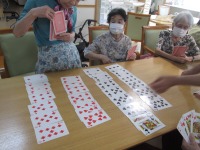こんにちはデイサービスです。今月最初のレクはカードゲームを行いました。利用様から人気の「都道府県名ゲーム」とトランプで「7ならべ」や「ババ抜き」を二つのグループに分けて行いました。都道府県名ゲームは漢字の書かれているカードを二枚選んでいただきそれを組み合わせて都道府県名になるようにするという少し脳トレのようなゲームです。例えば「沖」と「縄」の2枚のカードを選び組み合わせ「沖縄」と答えるといった感じです。さらにその都道府県の名産を一つ答えていただきました。沖縄と答えた方は「沖縄と言ったらサトウキビ!」と元気よく答えてくださいました。またトランプチームは久々のババ抜きで「どーゆーゲームだっけ? 忘れちゃったよー」と仰る方もいましたがだんだんとやっていくうちに思い出されとても真剣に参加されていました。みなさまカードゲームはお好きなようで大変盛り上がっていました(^^♪