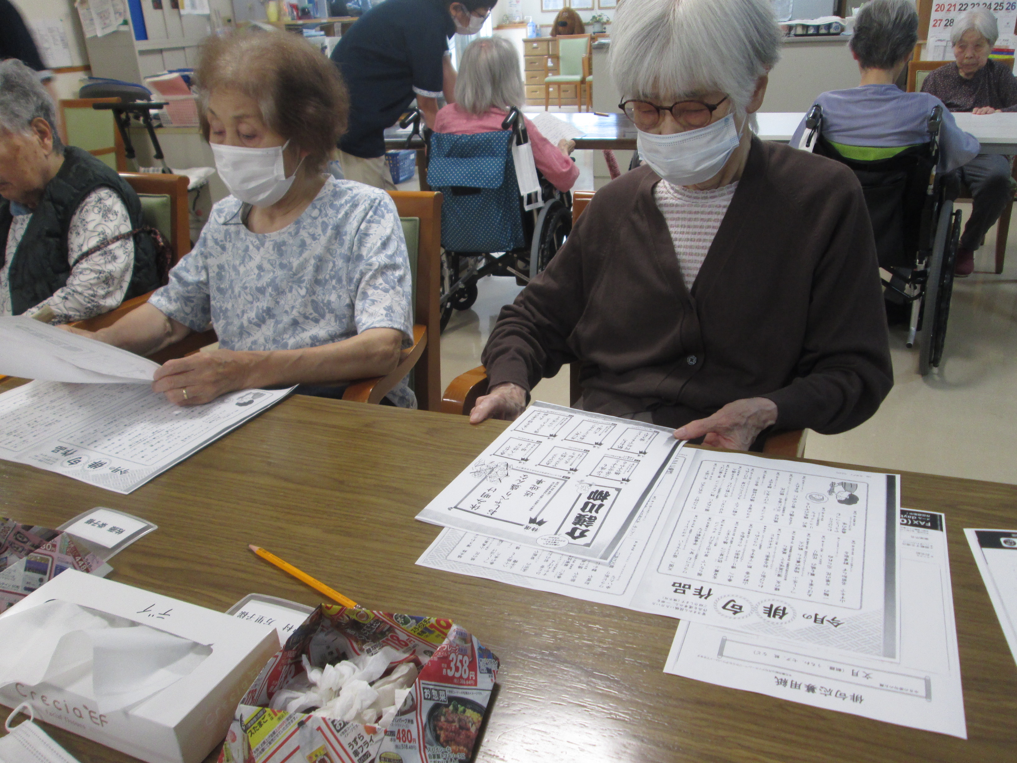 こんにちは、デイサービスです。今日は介護川柳レクということで、前半は月間デイに掲載されている作品を参考に読ませてもらい、後半はご利用者様に実際に川柳を作ってもらいました。川柳というと難しいそうですが、敷島デイでは毎月介護川柳レクを行っているので「では実際に介護川柳を作ってみましょう」と職員が話すとご利用者様も当たり前のように作り始めてくださいます(笑)「脳トレでひ孫に負けるジジとババ」「今日も又足腰痛い年のせい」「人生もここまでくれば未練なし」クスッと笑ってしまう作品やしみじみとしてしまう作品を詠んでくださいました(*^-^*)