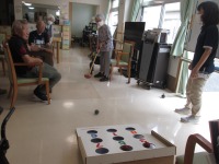 こんにちはデイサービスです。今日はゲームレクの中でも人気のパターゴルフを行いました。9個の穴が開いた板にそれぞれ数字が書いてあり、パターを使って穴に入るようにボールを投げてもらいその合計点を競っていただきます。みなさまパターを握ると真剣な表情でボールを転がしていらっしゃり、点数の合計を皆様に足し算していただいて同時に脳トレもしていただきました。本日のトップの方はなんとゴルフ経験ゼロの方でしたが、「旦那さんがやっていたのをいつも近くで見ていたからなんとなくできるのよ」と仰っていました(^^♪ 本日も大盛り上がりの一時間でした♪