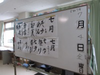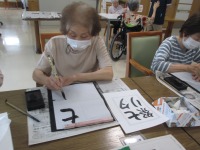 こんにちは、デイサービスです。今日の書道教室は「七月」「文月」「そうめん」「七夕祭り」「初夏」「無花果」のお手本を用意しました。毎回、その時期にあったお手本をいくつか用意してお好きなものを選んでいただいています(*^-^*)皆さん集中して取り組んでくださいました。納得できる作品に仕上がるまで何枚も書き上げて、その中から自信のあるものを選んでもらい、デイルームの書道コーナーに飾らせてもらっています。お互いの作品をほめ合うのも書道レクの恒例となっています(笑)