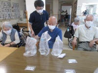 こんにちは、デイサービスです。今日はこの季節にぴったりの団扇を使ったゲームレクを行いました。はじめは「うちわでビニール飛ばし」という敷島デイでは初めて行うゲームです。ペットボトルにビニールをかぶせたものをうちわで扇いでビニール袋を外します。簡単そうに見えますが扇ぎ方にもコツがいるようです(@_@)続いて「うちわでお手玉リレー」です。うちわに乗せたお手玉をお隣のご利用者様にリレーで繋ぎました。日用品の中にもゲームで使えるものがたくさんあるんだなぁと感じました(^^♪