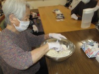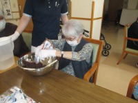 こんにちは、デイサービスです。今日の料理教室は豆腐白玉ぜんざいでした(^^♪粒あんと水を同量混ぜて、ぜんざいを作って冷蔵庫で冷やしておきました。絹豆腐と白玉粉を混ぜて白玉団子にしてお湯で茹で、氷水で冷やし、ぜんざいと合わせて完成です。今日も前橋は33℃の暑さだったので、ヒンヤリおやつが大好評でした。