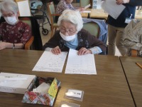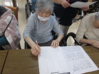 こんにちはデイサービスです。今日は毎月恒例の介護川柳を行いました。見本の介護川柳の作品を参考にしていただき、その後みなさまに川柳を考えていただきました。なかには初めての方もおり苦戦されてましたが、職員と一緒に楽しそうに取り組まれていました。介護川柳が得意な方は開始5分でスラスラと書いておりました。いくつか作品を紹介します。「明後日は年金支給日忘れずに」「庭に咲くアジサイの色、妻に似て」「笑いとは金のかからぬ私の薬」と思わずクスッと笑えるようなセンス良い作品を考えていただきました。みなさま他の方の作品を笑顔でご覧になりその後のおやつタイムでも川柳の話題で盛り上がっていました(^^♪