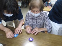 こんにちは、デイサービスです。今日は7月のカレンダー制作レクでした。折り紙でアサガオと葉っぱを作ります。通常の折り紙を四つ切した小さい折り紙を使ったので、細かい作業になり、とても苦戦されていました(>_<)アサガオの配置を考えて葉っぱとツルを貼り付けます。時間に余裕がある方はカレンダー部分を色鉛筆で塗ってもらい、ご自分だけのカレンダーの完成です。「部屋に飾るのが楽しみ」「孫が喜ぶんだよ」と皆様とても大切そうに持ち帰ってくださいました。