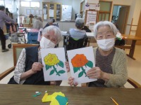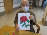 こんにちはデイサービスです。今日のレクはバラのちぎり絵を行いました。バラは赤・ピンク・黄色・オレンジなどいろいろな色があるので皆様何色にするか迷われていましたが、やはり赤がいちばん人気のようでした。花びらは細かく折り紙をちぎって貼り付ける作業は他の花よりも大変だと思いますが、本日の利用者様は手先が器用な方が多く、とてもスムーズに作業されほとんどの方が時間内に仕上がりました。「きれいに出来たから部屋に早く飾りたいな(^^♪」「細かい作業だから大変だったけど仕上がって良かったよ!」と口々に仰っていました。みなさま周りの方とお互いの作品を嬉しそうに見せ合っていました(^^♪