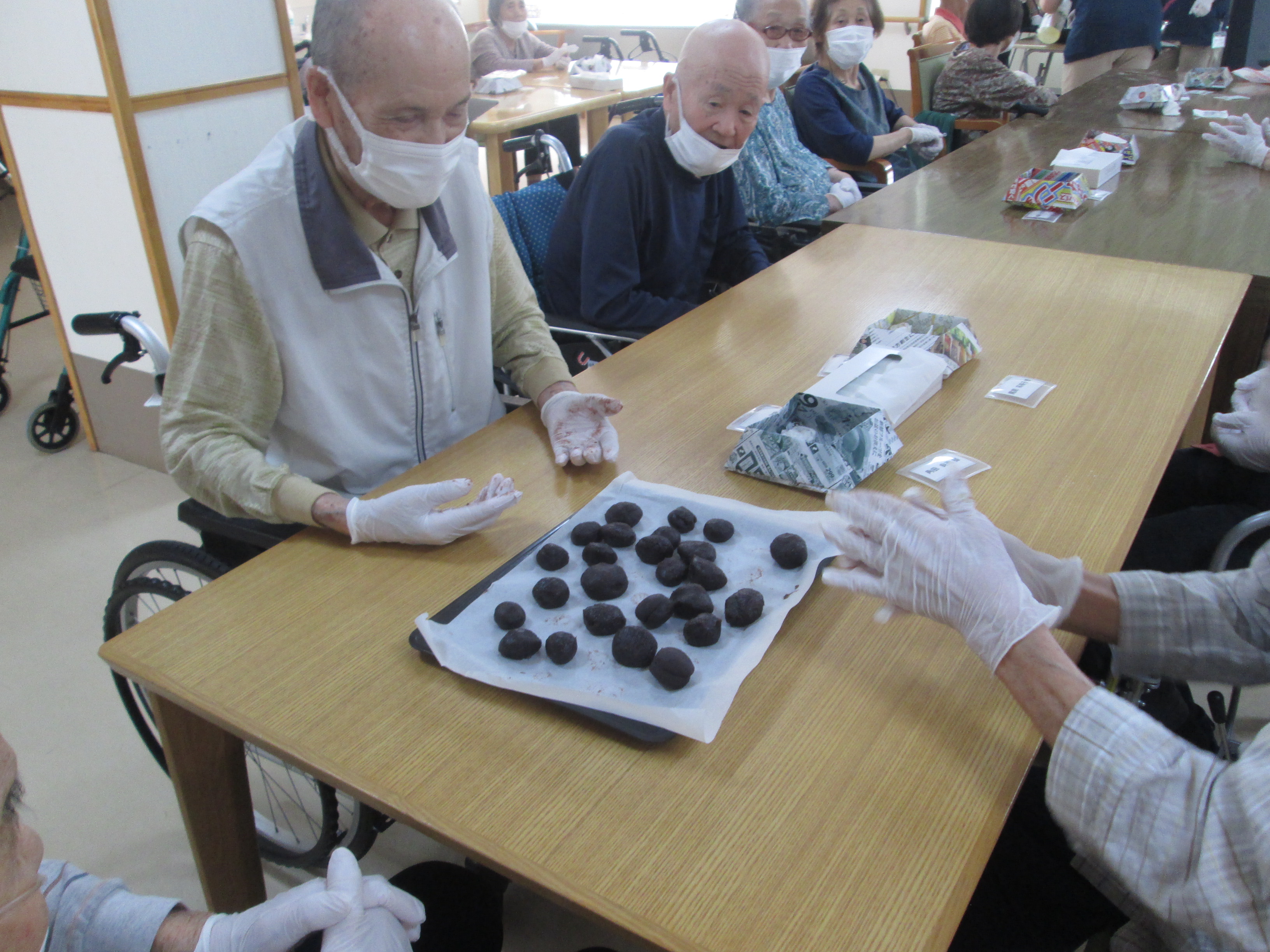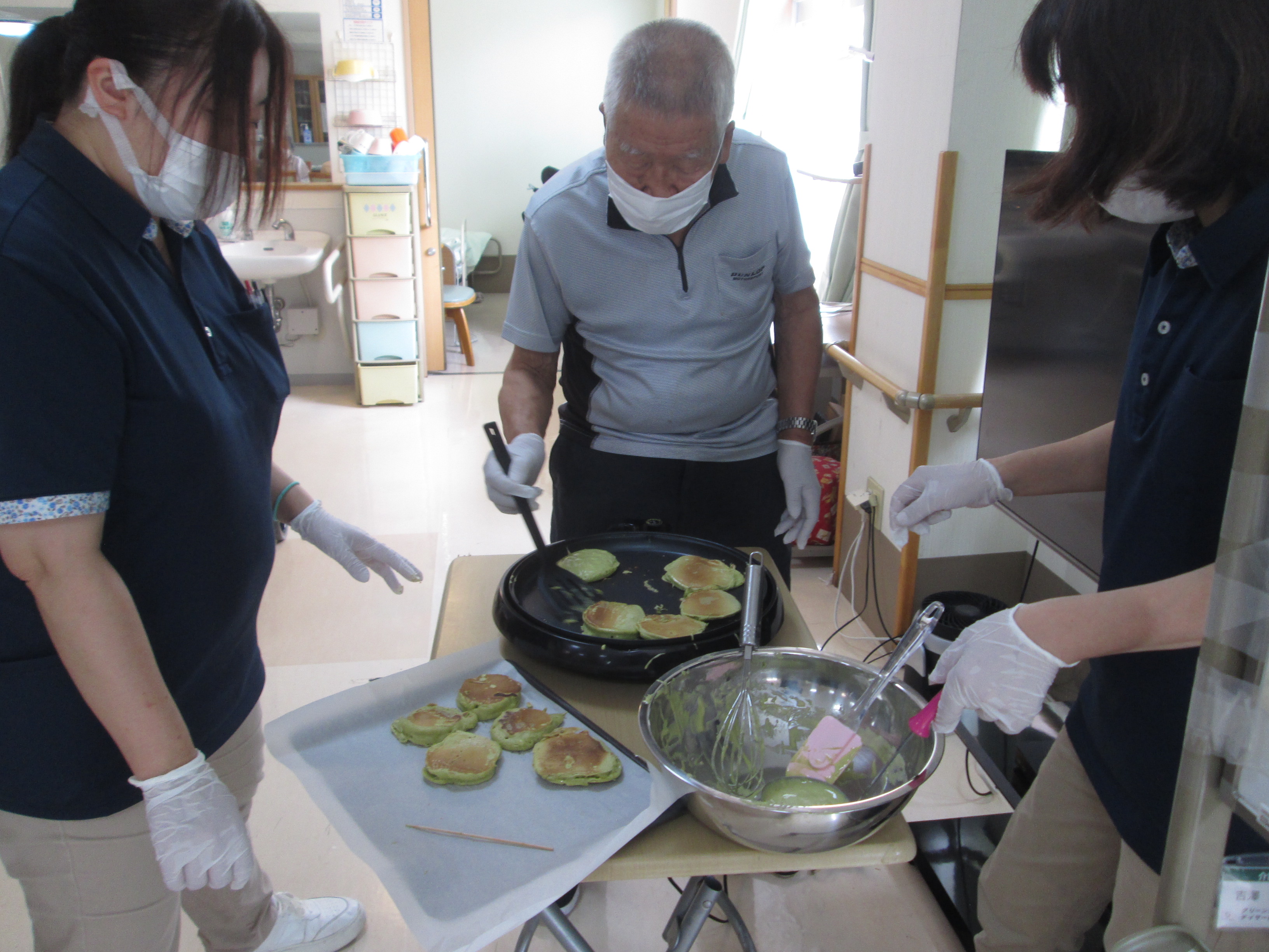 こんにちは、デイサービスです。今日は抹茶どらやき作りを行いました。ホットケーキミックス、卵、牛乳、抹茶をよく混ぜて、ホットプレートで焼きます。焼いている間に挟むあんこを丸めてもらいました。仕上げはご自分で食べるどら焼き生地にあんこ玉を挟んで生クリームをトッピングしました。「食べるなら美味しくしたいから頑張るよ。」と男性のご利用者様が大活躍してくださいました(*^-^*)「お店で売っているどらやきみたいで美味しいよ。」と嬉しい感想を聞かせてもらえました♪