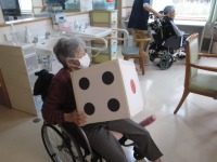 こんにんちは、デイサービスです。今日はサイコロを使ったゲームを行いました。敷島デイには手作りの大きなサイコロがあります(^^)/ご利用者様にサイコロを振ってもらって出た目の数に書いてある「好きな映画を教えてください」「何人きょうだいの何番目ですか」「得意な料理は何ですか」等の質問に答えてもらったり、「足踏みを10回してください」など書いてある動きをしていただきました。大きなサイコロに触れることがないのでみなさん「こんな大きいサイコロどこに売ってるの?」と興味深々でした(*^-^*)席が離れていて普段はお話をする機会があまりないご利用者様どうしもこのゲームでお互いのことが知ることができました♪