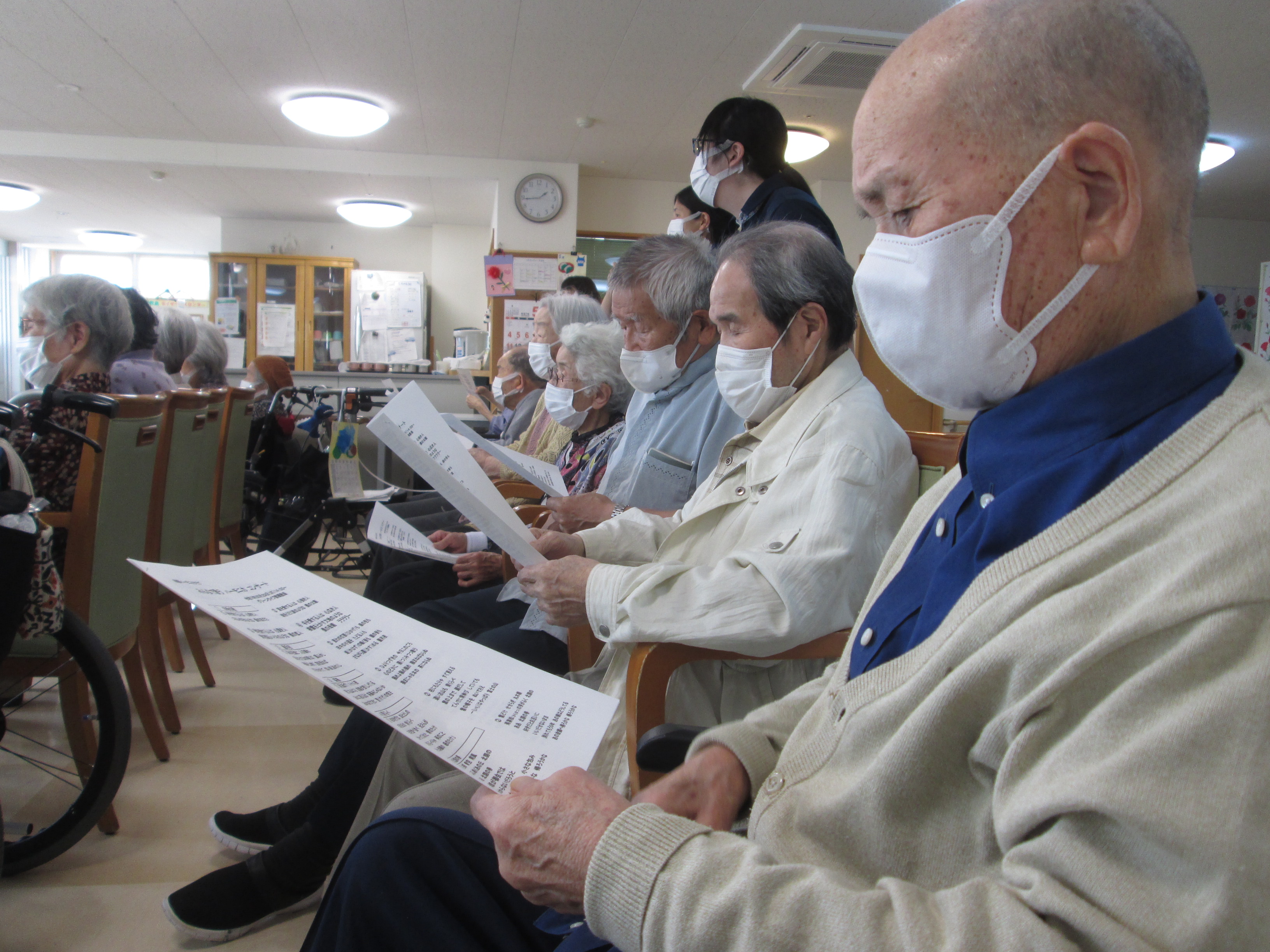 こんにちは、デイサービスです。今日は南橘ハーモニカクラブの皆さんが演奏に来てくださいました。前回ハーモニカ演奏に来てくださったのが1月だったので、今日の演奏をご利用者様もとても楽しみにされていました(^^♪ 四季の歌、朧月夜などの唱歌から知床旅情、北国の春などの歌謡曲までたくさん聞かせてもらいました。歌詞カードを準備してくださるので演奏に合わせて歌を口ずさむことができます♪1時間十分楽しませてもらえました(*^-^*)「次はいつ来てくれるかな」と次回をすでに待ちわびています♪