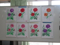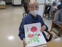 こんにちはデイサービスです。今日は水彩画ということでこの時期見頃を迎えるバラの花を塗っていただきました。はじめに皆様にはバラにはどんな色があるかお聞きしました。赤・ピンク・黄色・紫・オレンジなどみなさま口々に答えてくださいました。その後,筆を持つとみなさま真剣な表情で取り組まれ色鮮やかなバラの花が仕上がりました。定番の赤や深みのある紫色も人気でしたが、中には可愛らしいオレンジ色の方もいらっしゃいました。色とりどりのバラの花が咲きデイルームがまるでバラ園のようでした。その後のおやつタイムでもバラの話題で盛り上がっていました。