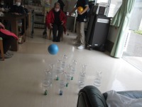 こんにちはデイサービスです。今日のレクは毎月恒例のボーリングを行いました。ここで行うボーリングは空のペットボトルにビー玉を入れたものをピンに見立て床に逆向きに立てて行います。投げるボールは軽いものですが、本日の利用者様はボーリング経験者が多くストライクを出す方が何人もいらっしゃいました。「昔よくやってたからボーリングは得意だよ」と笑顔でガッツポーズをされる方も見られました。ワイワイと楽しそうに取り組まれ大盛り上がりのご様子でした。