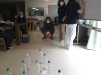 こんにちは、デイサービスです。今日のゲームレクはボウリングでした。ペットボトルに重しとしてビー玉を入れたものがピンになっています。ゴムボールを転がしていただくのですが、立っても座ってもどちらでもよいというルールで行いました(*^-^*)昭和40年代のボウリングブームの時にボウリング場に通ったというご利用者様はマイボール、マイシューズを持っていたそうです。勝手が違うので当時ほどうまくはいかないとのことでしたが、「懐かしいね、いろいろ思い出したよ」と嬉しそうに話してくださいました。
