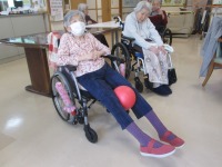 こんにちはデイサービスです。本日は機能訓練士による座ったまま出来るリハビリ体操を行いました。はじめに両手を上げ右の親指をたおした状態から10を数えていただきました。皆様苦戦しながらなんとか数えることができ「簡単そうで結構難しいね」と仰っていました。座ったまま手足を動かす体操や肩を回す運動をし一度一休みしていただき、後半はボールを使った体操を行いました。ボールを落とさないように足で挟んでいただきその場で立ち上がっていただきました。なかなか難易度の高い体操ですが今日の利用者様は皆しっかりできていました。「凄く疲れたけど楽しかったよ(^^♪」と皆様とても満足されたご様子でした。