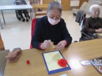 こんにちは、デイサービスです。今日は母の日のカーネーション飾りを制作しました。おはながみで赤色のカーネーションの花の部分を作り、茎の部分は色画用紙を使用しています。台紙にリボンや「お母さんありがとう」のメッセージも貼って完成です。「こんなに素敵なカーネーションができた」「部屋に飾るのが楽しみ」と皆さんとても嬉しそうに持ち帰られました(*^-^*)