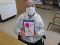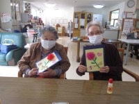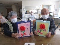 こんにちはデイサービスです。本日は昨日に続き母の日制作を行いました。皆様にはお花紙で可愛らしいカーネーションの花の部分を作って頂き、あらかじめ準備してあった葉や茎、ハッピーマザーズデイと書かれたハート形の紙などをのりで貼りつけ、茎の部分にカラフルなリボンを付けて完成です。お花紙をめくる作業に苦戦してる方もいらっしゃいましたが、職員と一緒に楽しそうに取り組み可愛らしい作品ができました。「こんなに可愛いくできたよ。孫に見せたいな」「可愛く出来たから早く部屋に飾りたいな(^^♪」と皆さまとても嬉しそうなご様子でした。今回の制作も大成功でした\(^_^)/