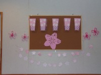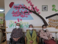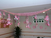 こんにちはデイサービスです。今日は春の制作ということで桜の壁面制作を行いました。皆様にはピンクのお花紙で可愛らしい桜のお花を作って頂きました。花びらを一枚一枚めくっていただく作業に苦戦されていらっしゃいましたが、楽しそうにわきあいあいと取り組まれ、できた桜の花を皆様で壁の木に貼っていただきました。とても豪華な桜の木が完成し、皆様とお写真を撮らせていただきました。皆様桜の壁面をご覧になり「きれいだねー。本物みたいだね-」「春を感じるね-」と笑顔で仰っていました。