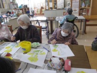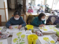 こんにちは、デイサービスです。今日は菜の花の下絵を使って水彩画に取り組んでもらいました。この季節にぴったりの題材です(*^-^*)特に食用は1月~3月がピークを迎えるとのことで、みなさん色塗りに熱心に取り組まれながらも「菜の花は辛し和えとかおひたしが美味しいよね」「天ぷらもおすすめだよ」など食材としての話題で盛り上がっていらっしゃいました。完成作品はデイルーム水彩画コーナーに貼ってしばらく春を感じたいと思います(^^♪