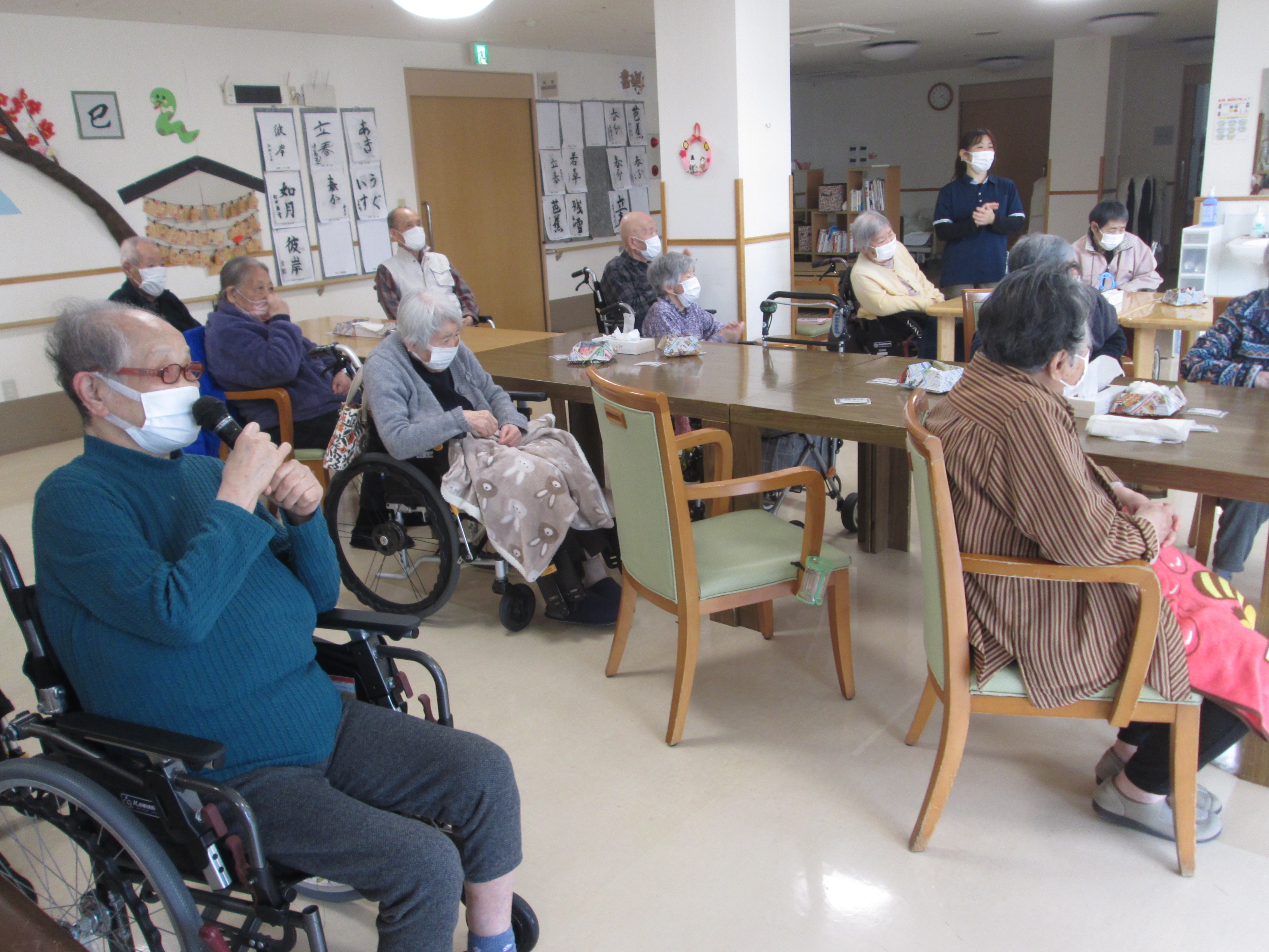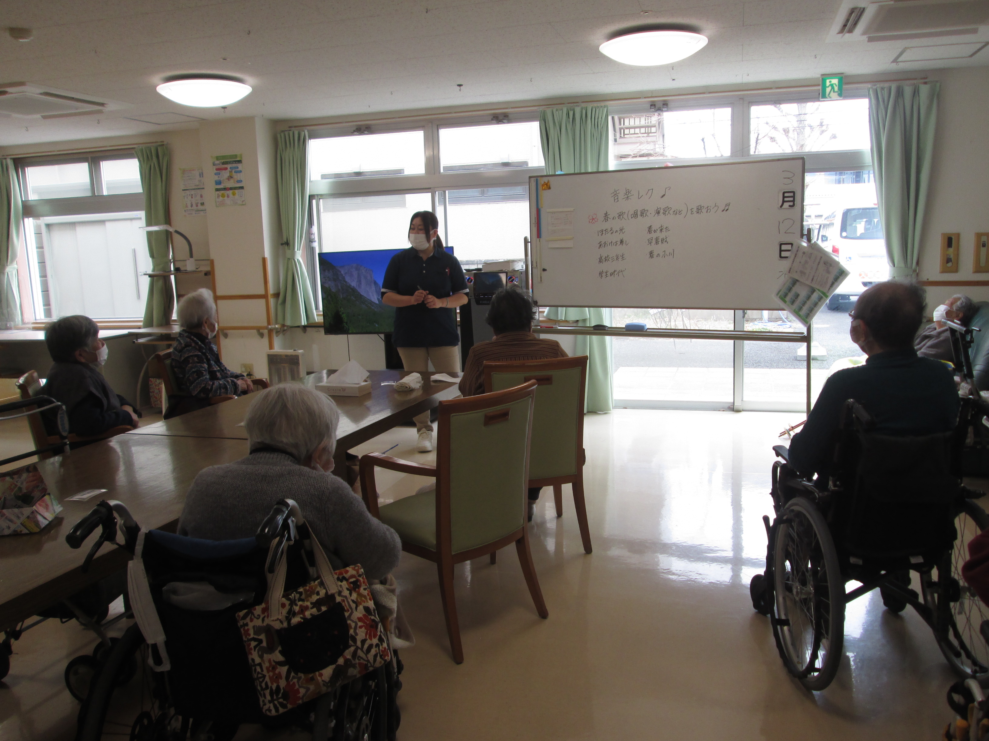 こんにちは、デイサービスです。今日の音楽レクは前半は「卒業シーズンの歌と春の歌といえば何があるか」の質問に答えていただきました。蛍の光、仰げば尊し、春の小川、早春賦、花などの唱歌のほかにも北国の春、川の流れのように、野に咲く花のようになどの歌謡曲もたくさん出てきました。答えが出たところで、みなさんで合唱してみました。途中、マイクを持っていただいたところ、立って歌って下さる方もいらっしゃったりと大盛り上がりとなりました(^^♪後半はイントロクイズを行いました。こちらも聞いたことはあるし歌えるけれど曲の題名が出てこないといったことが多く、良い脳トレにもなったと大好評でした(*^-^*)