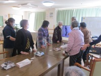 こんにちはデイサービスです。今日は機能訓練士による手足を使ったリハビリ体操を行いました。座ったまま膝を90度曲げる伸ばすを10回繰り返す運動から始まり、両手を真上に思い切り伸ばし1,2,3,と掛け声をかけながらゆっくり下ろすこの動作を10回繰り返すなど、座ったまま利用者様でも楽しく出来る体操を行いました。みなさま熱心に取り組まれていたのですが、立った状態でイスの背もたれに手を置き片脚ずつ真横にゆっくり開く体操では「これは筋肉が付きそうだね」「家でも出来そうだから頑張ってみようかな」とみなさま熱心に取り組まれていらっしゃいました。また次回の機能訓練が今から楽しみです。
