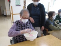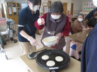 こんにちは、デイサービスです。今日の料理教室はホットケーキ作りを行いました。ホットケーキミックスと牛乳を混ぜて、ホットプレートで焼き、生クリームとフルーツとシロップをお好みでトッピングしてもらって完成です。ご利用者様からは「ホットケーキは初めて作るから楽しかったよ」「ちょうどいい甘さで美味しかった」とうれしい感想を聞かせていただけました(*^-^*)