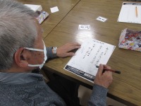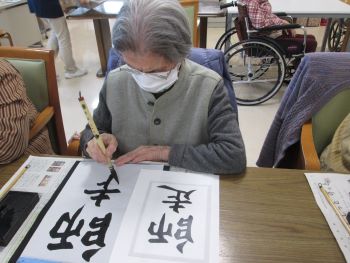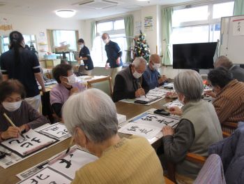 こんにちは、デイサービスです。本日のレクリエーションは書道でした。お手本には「北風」「年の瀬」「十二月」「師走」でした。文字を見ると改めて月日の速さを感じ「もう十二月かあ」「一年が本当に早いよね」と皆様が口々に話されており、職員も一年の早さに、毎年のことながら驚いております。いました。みなさまの一年分の作品を壁に貼っていますがそろそろお返しするときが近づいてきました。「今年もたくさん書いたなあ」「作品集ができるかも」としみじみ話されていました。