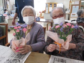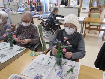 こんにちは、デイサービスです。本日のレクはフラワーアレンジメントでした。お花はいつもご近所のお花屋さんがランダムでお花を持ってきてくださいます。今日のお花は紫色のスターチスとピンクのスプレーカーネーションでした。女性の利用者様が多い日だったので紫とピンクの組み合わせがかわいいととても好評でした。皆様とてもいい笑顔で取り組まれており、久しぶりのフラワーアレンジメントでしたが、楽しんでいただけたようでよかったです。(*^^*)