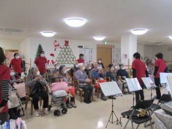 こんにちは、デイサービスです。本日の午後は慰問でママさん音楽隊の方々がいらっしゃいました。バイオリン、リコーダー、電子ピアノで「高校三年生」や「瀬戸の花嫁」など懐かしの曲を演奏してくださり、途中に「幸せなら手を叩こう」の曲に合わせて手遊びレクをやってくださいました。明日からは12月になるということで「きよしこの夜」をハンドベルを使用し演奏して聞かせてくださったりと、様々な楽器の音が聞こえるとても楽しい時間になりました。さいごは「ふるさと」と皆様で合唱(^^♪ あっという間の1時間でした!ありがとうございました!