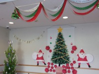 こんにちは、デイサービスです。デイルームにクリスマスツリーやタペストリーが飾られて、クリスマスの準備が整いました(*^-^*)ツリーの飾りつけやタペストリーに飾る折り紙のサンタクロースや星作りをご利用者様に手伝ってもらいました。壁面にはご利用者様が制作したクリスマスリースも飾られているのでデイルームがクリスマス仕様になっていてワクワクします(^^♪
