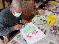 こんにちは、デイサービスです。今日はシクラメンの下絵を使って水彩画に取り組んでいただきました。冬になると見かけることが多くなるシクラメンですが、赤やピンクなどは定番カラーとして有名ですが、黄色や紫色といった珍しい色もあるそうです。ご利用者様にはお好きな色を選んでもらいましたが、ほとんどの方がピンク色で塗られていました(^^♪「鉢植えは何色にしようかな」「家でよく育ててたよ」などの会話を楽しみながら作品を完成してくださいました(*^-^*)