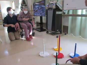 こんにちは、デイサービスです。本日はゲームレクで輪投げを行いました。10本の輪を投げていたただ来ましたが、いつもより少し距離を遠くしたので苦戦されていました(笑) 「手首が痛いから入らない」「10本も投げたら腕が痛くなる」と初めはおしゃっていましたが、いざ輪を持つと真剣な眼差しで10本投げ、「もう終わり!?」「もっと投げられるよ」と元気な姿を見せてくださいました。輪投げももちろんですがご謙遜もお上手です。