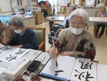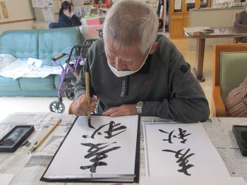 こんにちは、デイサービスです。本日は秋晴れのもと書道教室を開催しました。お手本は「あき」「しいたけ」「麦秋」「秋風」「秋刀魚」「降霜」でした。本日のみなさまからは「麦秋がいいね」「わたしも麦秋が書きたい」と麦秋の文字が人気でした。「平仮名のあきも可愛らしい感じで描きたい」とまた好評でした。文字だけで様々な秋を感じられた時間となりました。