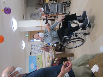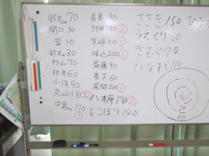 こんにちは、デイサービスです。本日のレクリエーションは射的大会を開催しました。ホワイトボードに書いた的は真ん中が100点、外に向かって50点・30点・10点と点数がつけられており、3回打った合計点を競いました。ど真ん中の100点を当てた方も何名かいらっしゃり、とても盛り上がりました。最高点は200点を獲得された方もおりみなさま拍手で笑顔が多くみられたレクとなりました。