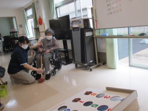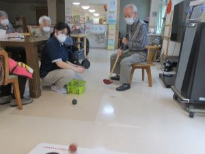 こんにちは、デイサービスです。本日のレクリエーションはパターゴルフを行いました。10月中旬にも関わらず午前中は気温27度でとても暑かったですが、午後になると雨がシトシトふってきて少し肌寒く利用者様方も「寒い」という声がちらほら聞こえてきました。そんな中、元気に体操をしパターゴルフに挑戦!みなさんで声を出し合って「頑張れ!」「いい点に入ってるよ!」など声援を送り合ったおかげで、体も心も温かくなりました。(*^-^*)