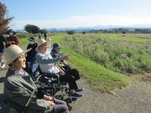 こんにちは、デイサービスです。本日は毎年恒例の「はにわの里」にコスモス見学に行きました。昨日からぐっと気温が下がりましたが秋晴れで午後は温かくなりお花見日和でした。みなさまとても気分転換になった様子で「きれいだね」「いっぱい咲いていてよかった」と笑顔いっぱいでした。残った方々は施設でイントロクイズに挑戦しました。懐かしの歌メロを口ずさむ様子がありこちらも楽しそうでよかったです。(*^-^*)