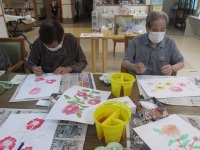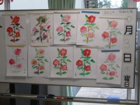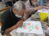 本日は水彩画ということで秋から冬にかけて咲く「山茶花」のお花の水彩画に取り組んでいただきました。薄いピンクや濃い赤など思い思いの色で色をのせていき出来上がった作品に皆様「きれいに塗れているね」「お手本みたいだね」と盛り上がっていました。水彩画コーナーには「稲穂」の水彩画が飾ってあるので今日「山茶花」に変えたいと思います(*^-^*)