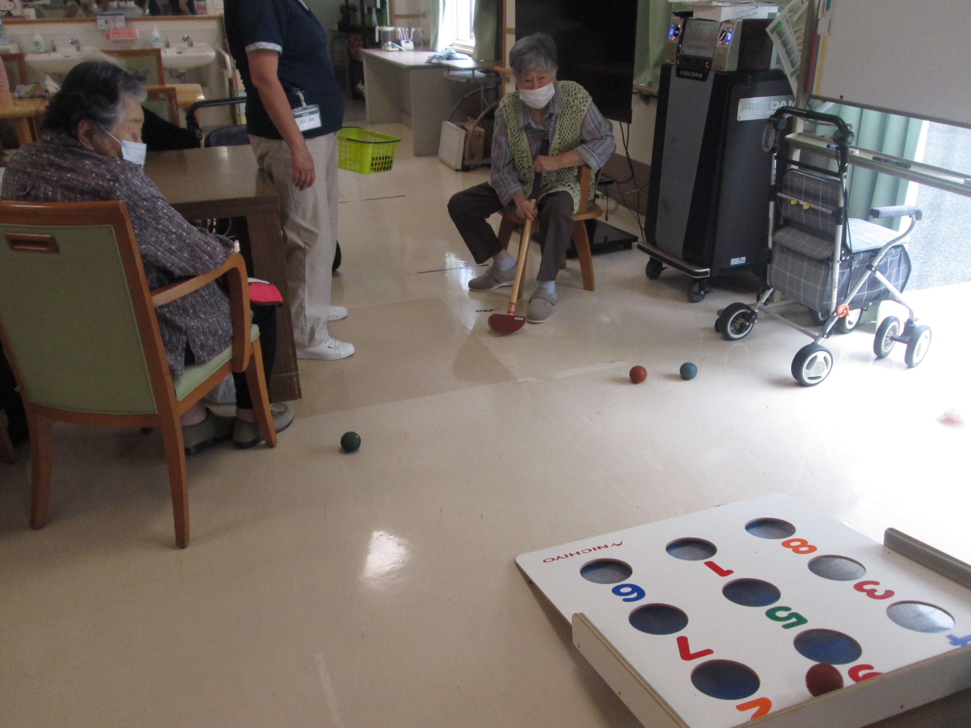 こんにちは、デイサービスです。今日のゲームレクはパターゴルフを行いました(^^♪「グランドゴルフはやったことあるけど、難しいんだよね」「お父さんがゴルフはやっていたけど私ははじめてやるよ」等の楽しそうな会話も聞こえるなか、高得点目指して取り組んでもらいました。「もっと力を入れた方がいいよ」等ご利用者どうしでお互いアドバイスもします(*^-^*)しっかりと体を動かした後の15時のお茶がいつもよりおいしく感じると大好評のレクでした。