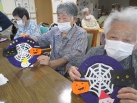 こんにちは、デイサービスです。今日は秋の制作教室ということでハロウィンリース🎃を作りました。紙皿をくりぬいておはながみを巻いて色付けをしたものがリースの土台になっています。ご利用者様には折り紙でかぼちゃのおばけ🎃ジャックオーランタンや黒猫を折ってもらいました。リースの中央は折り紙の切り絵でくもの巣が貼られています。「こんなにかわいいのができたから孫に見せよう。」「難しかったけど頑張ってよかった。」と完成作品に大満足のご様子でした(*^-^*)